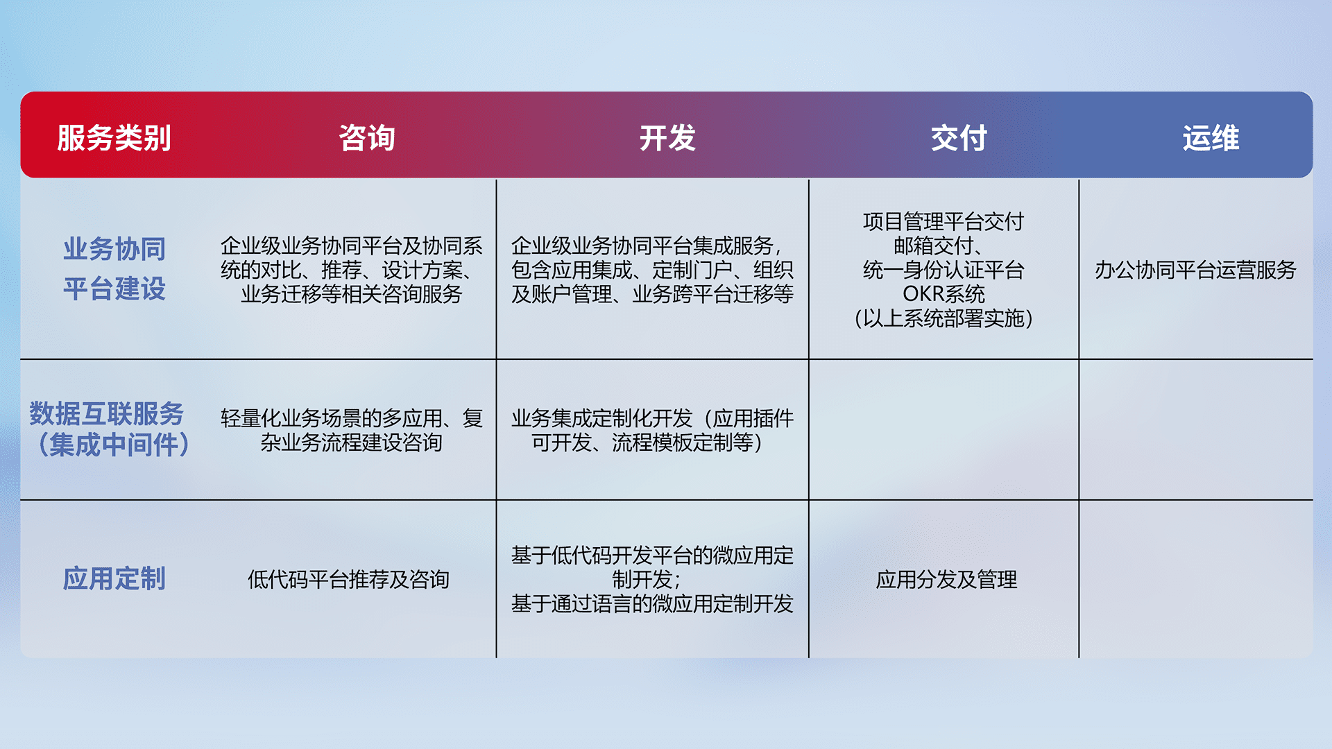 针对钉钉、、企微、、、IDaas等平台级产品提供产品的规划、、、方案、、、交付、、定制化开发等服务,,实现如统一协同办公、、、智能客户服务、、、、混合会议管理、、智能数据查询、、、等业务场景,,,实现数字化转型。。
