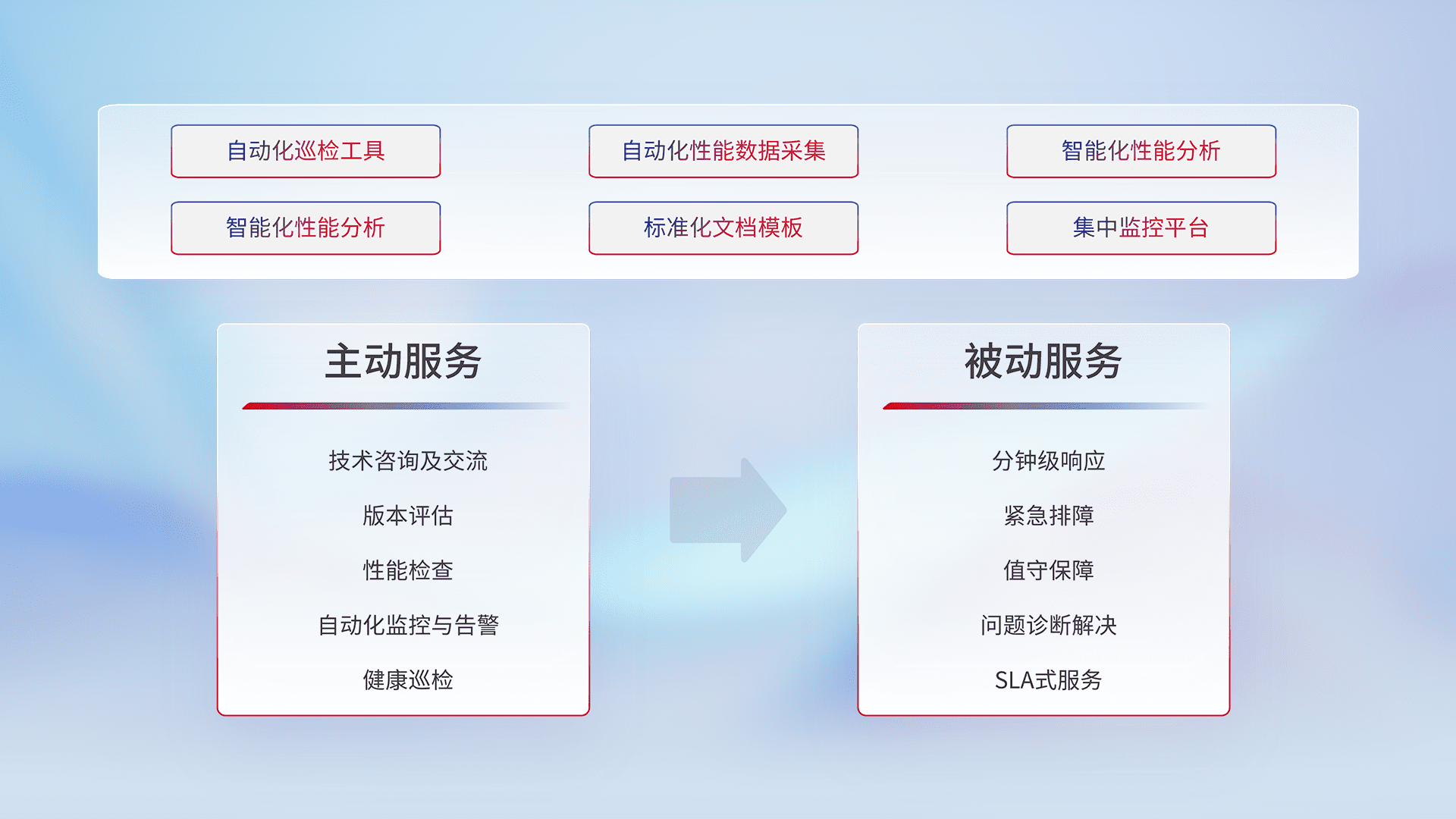 智能化工具和标准化文档,,保障服务质量,,,提供主动服务(包含技术咨询、、、、版本评估、、、、性能检查、、自动化监控与告警、、健康巡检)和被动服务包含(分钟级响应、、紧急排障、、值守保障、、、、问题诊断解决、、、、SLA服务)。。。